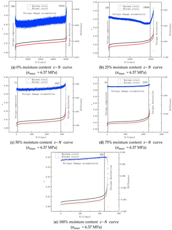 As can be seen from Figure 13, Each ε–N curve can be roughly divided into three stages, which correspond to the three loading stages acting on CA mortar from initial loading to fatigue failure. Stage 1: fatigue compression stage. In this stage, the vertical relative displacement of the specimen expands rapidly. The CA mortar pores are compressed which causes microcracks in CA mortar. Stage 2: fatigue damage accumulation stage. In this stage, the vertical relative displacement of the specimen develops extremely slowly, and this state lasts the longest, which corresponds to the stable propagation of microcracks in CA mortar. Stage 3: fatigue failure stage. At this stage, the vertical relative displacement of the specimen increases rapidly, and the final specimen fails, which corresponds to the instability propagation of the micro-cracks of the CA mortar. Under the same fatigue loading times, the higher the moisture content, the faster the damage develops. Moreover, by observing the difference changes under various moisture contents, it is found that the difference curve as a whole shows a pattern of first decreasing, then flattening, and finally increasing. This corresponds to the above three stages.