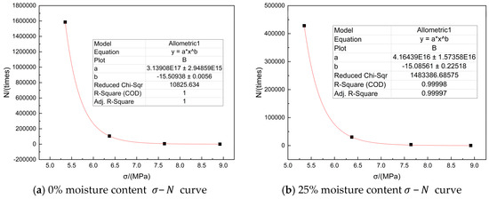 Before carrying out fatigue tests, the stress level must be determined. At present, many scholars conduct fatigue tests under the condition of controlling stress levels. Although this mode is simple and easy to control, in actual engineering, this mode may not be able to fully simulate the actual situation. Because the strength of CA mortars with different moisture contents is quite different. If different stress levels are used for loading tests, the fatigue stress varies greatly, which is not consistent with the actual conditions. In order to more intuitively compare the fatigue properties of CA mortar under the different humidity conditions, the same stress is used to load on the CA mortar with different moisture conditions. The fatigue stress and corresponding stress level are shown in Table 5.