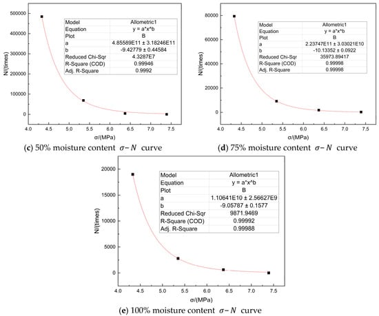 Fitting curves of fatigue performance parameters at different moisture contents.