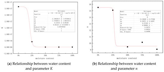 The parameters K and n are fitted with the moisture content. The fitting results all satisfy the Boltzmann equation. The fitting equations are shown in Equations (6) and (7). The fitting curves are shown in Figure 15.