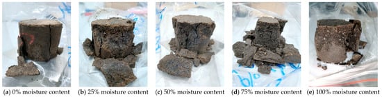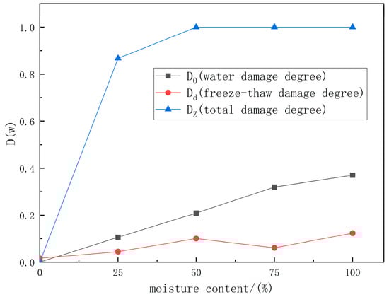 As shown in Table 9 and Figure 16, with the increase in moisture content, each damage degree gradually increases. The water damage degree and Freeze–Thaw damage degree increase almost linearly, but the increase in total damage degree is not linear. The increase rate of the total damage degree gradually decreases, which is very high in the initial stage with moisture content lower than 25%, then slows down in the stage with moisture content from 25% to 50%, and finally, almost turns to zero in the stage with moisture content higher than 50%.