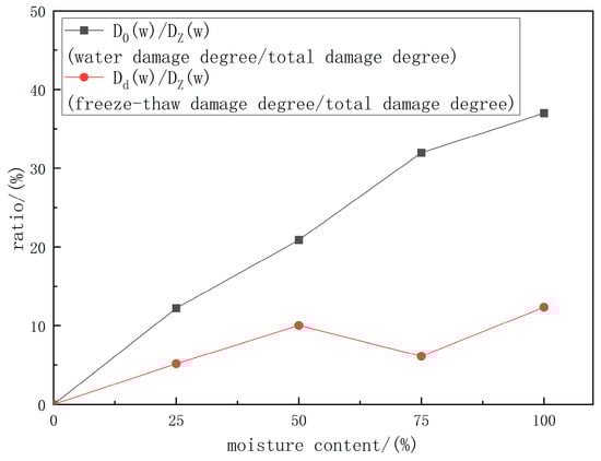 In order to analyze the contribution of water damage and Freeze–Thaw damage to total damage, the variation trend of and with moisture content can be further obtained, as shown in Table 10 and Figure 17. It can be seen that as the moisture content increases, the value and value increase linearly as a whole. The values of from 25% to 100% are 12.23%, 20.90%, 31.97%, 37.00%, respectively. The values of from 25% to 100% are 5.17%, 10.03%, 6.12%, 12.34%, respectively. This indicates that the contribution of humidity damage to total damage and Freeze–Thaw damage to total damage increased both, but the contribution of humidity damage to total damage increases more. In addition, the contribution of humidity damage to total damage is more significant than that of Freeze–Thaw damage to total damage.