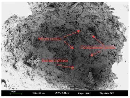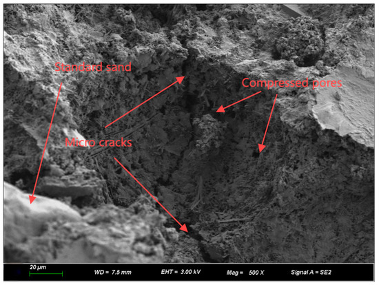 In order to reveal the fatigue failure mechanism of CA mortar under the coupling of humidity and Freeze–Thaw, the effect of humidity on the micromorphology of CA mortar was investigated. The micromorphology of CA mortar with different moisture contents after fatigue load was studied by SEM electron microscopy. The observation results are shown in Figure 19 and Figure 20. Unlike Zhao et al. [16], which analyzed the structure of CA mortar, this section studies the microscopic mechanism of CA mortar failure. The microscopic failure of the CA mortar is shown in Figure 21.