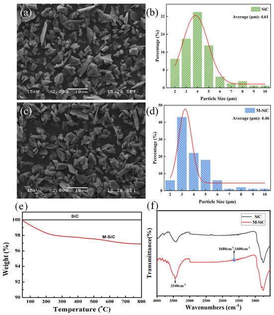 In addition, infrared spectroscopy analysis was conducted on SiC and M-SiC. As shown in Figure 3f, new absorption peaks appeared at 1600–1680 cm−1 and 3340 cm−1 for M-SiC. The absorption peak at 3340 cm−1 is attributed to the O-H and N-H stretching vibrations of polydopamine (PDA) attached to the surface of the modified M-SiC material [43]. The absorption peak intensity in the 3000–3500 cm−1 region of M-SiC is significantly stronger than that of SiC material. This is because the peak intensity in the 3000–3500 cm−1 region is enhanced by the functional groups of PDA [44,45], which has introduced -OH and -NH bonds on the surface of M-SiC due to the deposition of PDA.