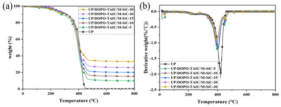 Thermogravimetric analysis (TGA) was conducted on UP and UP/DOPO-TAIC/M-SiC composites to further investigate the thermal stability of flame-retardant composite UP/DOPO-TAIC/M-SiC. The main thermal degradation parameters are listed in Table 6. As shown in Figure 5a, neat UP material began to decompose progressively with the increase in temperature. The thermal degradation behavior of the UP/DOPO-TAIC/M-SiC composite was similar to that of the UP matrix. However, the T5% of UP/DOPO-TAIC/M-SiC-30 decreased by 13.5% compared to neat UP. This phenomenon can be attributed to the initial cleavage of some weaker bonds in the organic flame retardant-DOPO-TAIC, such as P-O-C and P-C bonds. Additionally, the polydopamine (PDA) in the M-SiC powder also decomposed with increasing temperature, which would lead to the decrease in T5% of UP/DOPO-TAIC/M-SiC. Similarly, the maximum decomposition temperature of UP/DOPO-TAIC/M-SiC-30 reached 393 °C, which was a 6.9% reduction in Tmax compared to neat UP.