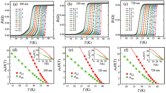- Ferrando, V.; Orgiani, P.; Pogrebnyakov, A.V.; Chen, J.; Li, Q.; Redwing, J.M.; Xi, X.X.; Giencke, J.E.; Eom, C.B.; Feng, Q.R.; et al. High upper critical field and irreversibility field in MgB2 coated-conductor fibers. Appl. Phys. Lett. 2005, 87, 252509. [Google Scholar] [CrossRef]