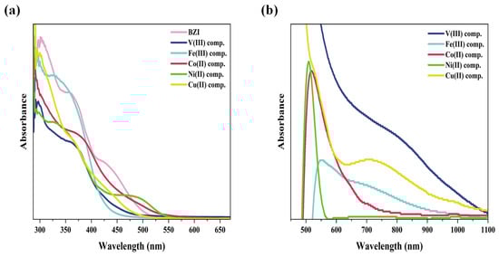 The UV–Visible spectra of the BZI ligand and its M-complexes were studied in DMSO at 200–1100 nm (Figure 2a,b), and their data were recorded in Table 1. As observed in the UV–Vis spectrum of the BZI ligand, three distinct absorption bands are present. The band with the maximum energy, which is observed at 301 nm, can be attributed to the transition of the benzene ring from π to π*. On the other hand, the band appearing at 358 nm is associated with the transition of the imine group from π to π*. It is believed that the n → π* transition of the imine group is responsible for making the lowest energy band appear at a wavelength of 421 nm [53]. There was a bathochromic shift of the n → π* transition in all complexes when compared with the ligand, which is proof of the participation of imine nitrogen in chelation with metallic ions. This shift occurred as a result of the coordination process [54]. A broad absorption band at 719 nm is observed in the visible spectra of the V(III) complex, as depicted in Figure 2b. This band is attributed to the transition from 3T1g to 3T2g (F), which suggests that the V(III) complex possesses an octahedral (Oh) organization. There is a correlation between the d2 electronic structure of V(III) complexes in an Oh geometry and the magnetic moment value of the V(III) complex, which is 2.52 BM [55]. A pair of absorption bands may be observed in the visible spectra of the Fe(III) complex. These bands are located at 655 and 554 nm, and they are attributed to the transitions from 6A1g to 4T2g (G) and 6A1g to 4T1g (G), respectively. In accordance with the Oh geometry of the Fe(III) ion, these transitions manifest themselves. There is a high spin Fe(III) configuration (d5) that is compatible with the μeff value of the Fe(III) complex, which is 5.67 BM [56]. There are three transitions that can be found in the visible spectrum of the Co(II) complex. These transitions are located at 705, 622, and 519 nm. These transitions are described as follows: 4T1g (F) → 4T2g (F), 4T1g (F) → 4A2g (F), and 4T1g (F) → 4T1g (P), respectively. These transitions indicate the octahedral geometry around the Co(II) ion [54,57,58]. The Co(II) complex has a magnetic moment of 4.83 BM, which corresponds with high spin octahedral Co(II) ion (d7) [59]. In the case of the Ni(II) complex visible spectrum, there is one absorption band present at 500 nm, which is assigned to 3A2g (F) → 3T1g (P) transition and that proves that the Ni(II) complex has an octahedral structure [60]. The μeff value of the Ni(II) complex is equal to 2.91 BM, which is compatible with the d8 electronic structure of Ni(II) complexes in the geometry of an Oh [61]. In the visible spectrum of the Cu(II) complex, there are three absorption bands that may be observed at 989, 707, and 513 nm. These bands are attributed to the transitions of 2B1g → 2A1g, 2B1g → 2B2g, and 2B1g → 2Eg, which occur sequentially. A tetragonal distorted octahedral geometry is confirmed by the fact that the magnetic moment value of the Cu(II) complex is 1.69 BM. This indicates that the Cu(II) complex follows this geometry [62].