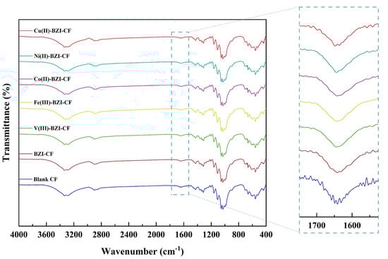 FT-IR spectra of the blank CF, BZI-CF, V(III)-BZI-CF, Fe(III)-BZI-CF, Co(II)-BZI-CF, Ni(II)-BZI-CF, and Cu(II)-BZI-CF.