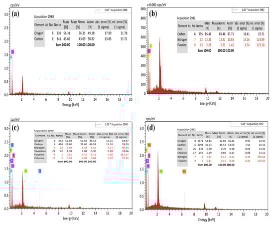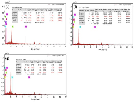The EDX analysis spectrum of (a) blank CF, (b) BZI-CF, (c) V(III)-BZI-CF, (d) Fe(III)-BZI-CF, (e) Co(II)-BZI-CF, (f) Ni(II)-BZI-CF, and (g) Cu(II)-BZI-CF. The different colors in each picture indicates different elements. Also Table inside each figure indicates the mass % and the error %.
