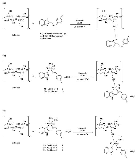 The supposed mechanism of the treated cotton fabric by (a) BZI ligand, (b) V(III) and Fe(III) complexes, (c) Co(II), Ni(II), and Cu(II) complexes.
