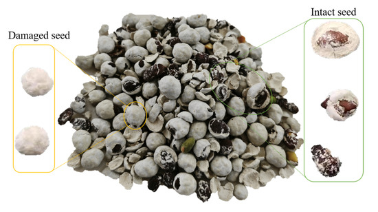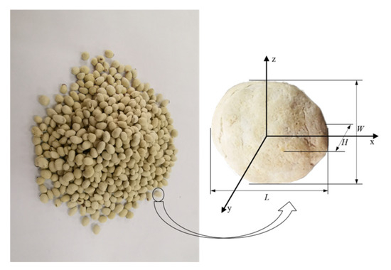 The experimental material consisted of coated Caragana korshinskii seeds suitable for growth in the Inner Mongolia region. Their basic physical parameters were measured to provide a foundation for subsequent physical and simulation experiments. The coated Caragana korshinskii seeds are shown in Figure 1.