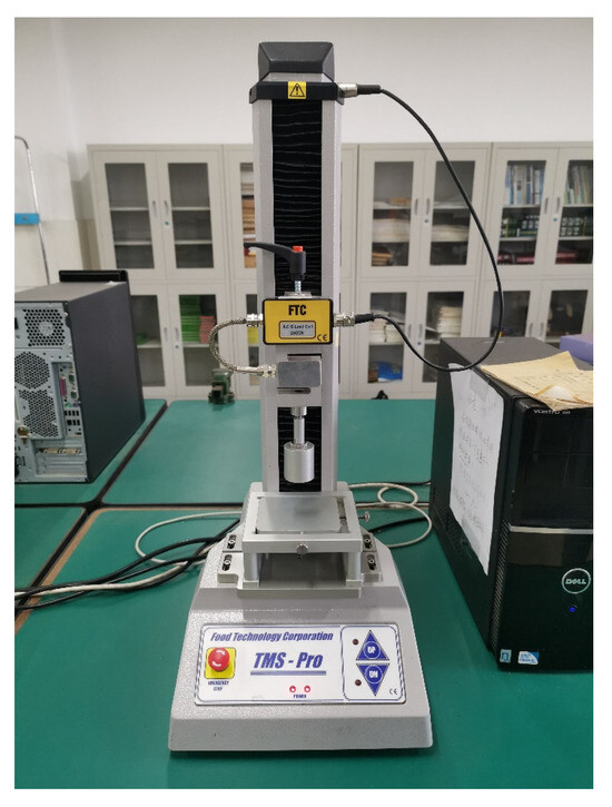 Based on the morphological measurements, the seeds were relatively small in size. Referencing the literature, the Poisson’s ratio range was determined to be 0.3–0.5 [12,20,21]. The elastic modulus of coated Caragana korshinskii seeds was obtained through compression tests using a professional food texture analyzer (TMS-PRO) [22], as shown in Figure 2.