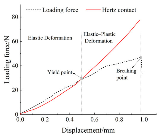 During the experiment, coated Caragana korshinskii seeds were placed horizontally on a plate and tested using a 10 mm diameter circular probe. The probe’s pre-test speed was set at 30 mm/min, test speed at 15 mm/min, and post-test speed at 30 mm/min. The seed deformation was set to 30%, with a breakpoint threshold of 70%. Loading was applied along the seed height direction, and load–displacement data during seed compression were obtained through software post-processing [12,23]. Figure 3 presents the force–displacement curve of the single-particle compression test. In the initial loading stage, the force–displacement relationship follows the Hertz contact model, indicating that the material primarily undergoes elastic deformation. As the loading force increases, the curve gradually deviates from the Hertz theoretical model and exhibits a significant change at the yield point, marking the transition to elastic–plastic deformation. With further loading, the material reaches the breaking point, corresponding to the inflection point where the curve declines, indicating material fracture.
