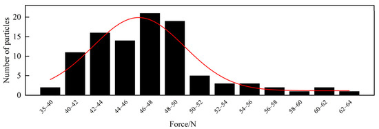 In 30 repetitive compression resistance tests of coated Caragana korshinskii seeds, the maximum compression resistance was 62.5 N and the minimum was 36.7 N, though these extreme values occurred infrequently. The compression resistance primarily fell within the 40 N–50 N range, as shown in Figure 4. This variation may be attributed to inconsistent coating shell thickness formed during the seed coating process, resulting in different strengths among coated Caragana korshinskii seeds. Additionally, inherent strength variations exist in the Caragana korshinskii seeds themselves. Based on the statistical distribution analysis of seed breakage force, data show that 98% of the seed samples break when the force exceeds 40 N. Considering that the main goal of this study is to maximize seed integrity, we have adopted a conservative approach by setting 40 N as the critical force threshold.