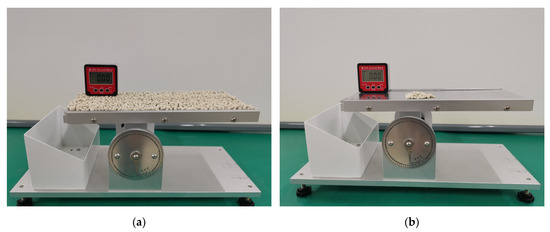 The static friction coefficient, defined as the ratio of maximum static friction force to normal pressure on the contact surface, was measured using a CNY-1 type inclined plane apparatus for both seed-to-seed and seed-to-aluminum plate interactions [26], as shown in Figure 5. To determine the static friction coefficient between seeds, a group of seeds was placed on a seed-covered inclined surface. The incline angle was gradually increased until the seed group reached a critical sliding state. The angle displayed on the digital angle meter was recorded and used to calculate the static friction coefficient between coated Caragana korshinskii seeds using Equation (2). For measuring the static friction coefficient between the seeds and the aluminum plate, the seed-covered surface was replaced with an aluminum plate, following the same testing procedure. After multiple trials and averaging, the static friction coefficient between coated Caragana korshinskii seeds was determined to be 0.295 ± 0.131, while the static friction coefficient between seeds and aluminum plate was 0.111 ± 0.036.