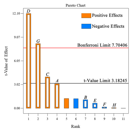 Analysis of parameter contributions from the Plackett–Burman experiments for coated Caragana korshinskii seeds, as shown in Figure 10, revealed that parameters A, C, D, G, and H exhibited positive effects on the angle of repose, indicating that the angle increases with these factors. Conversely, parameters B, E, and F showed negative effects, with the angle decreasing as these factors increased. A contribution rate analysis of the factors identified the top three influential parameters as D, G, and C, which significantly impacted the angle of repose. Based on significance levels, the key parameters were determined to be the seed-to-seed static friction coefficient, seed-to-aluminum static friction coefficient, and seed-to-seed coefficient of restitution.