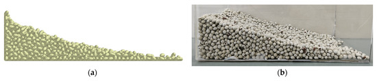 A virtual particle plane was established above the box compartment to generate coated Caragana korshinskii seed particles. The particle generation was set to dynamic mode with a generation rate of 5000/s, producing a total of 3500 particles. To balance experimental accuracy and computational efficiency, particles were simulated using fixed dimensions. The total simulation time was set to 15 s, with a particle generation period of 3.5 s, Rayleigh Time Step of 6.87 × 10−6 s, and grid size of 3R. The Hertz–Mindlin no-slip model was selected for particle contact modeling. After particle generation was completed, the drawer plate was rapidly withdrawn, allowing seeds to freely disperse and collapse, forming a natural pile state as shown in Figure 8b. The angle of repose was obtained through the linear fitting of the pile profile using Matlab software (2022).
