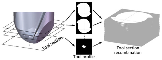 In this paper, the ball-end milling cutter is divided into several sections, and the section shape of the unworn tool section is obtained. Then the tool cross-section after wear is calculated according to the wear rate model, and the cross-section is reorganized to obtain the 3DWM, as shown in Figure 1. In general, cutting tool wear is mainly due to the cutting and extrusion of the blade on the workpiece material during the machining process, the force of the workpiece material on the rake face, and the friction between the flank face and the machined surface. The cutting tool wear rate model is shown as follows: