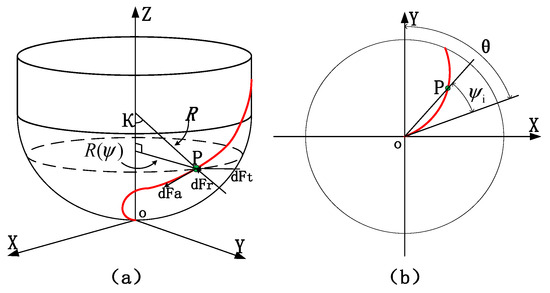 In order to solve the force distribution on the milling cutter and analyze the cutting contact relationship of tool–workpiece, it is necessary to construct the geometric model of the ball-end milling cutter. The cutting edge of the ball-end milling cutter is shown in Figure 2. The coordinate system (O, X, Y, Z) is the machine coordinate system. Point O coincides with the cutter tip and is the origin of the machine coordinate system. Where is the radius of the ball head, the spiral angle of the tool is , and is the position angle of any point P on the edge line of the ball head, as shown in Figure 2a. is the lag angle of any point P on the edge line of the ball head, and is the contact angle of the edge line of the end edge, as shown in Figure 2b.