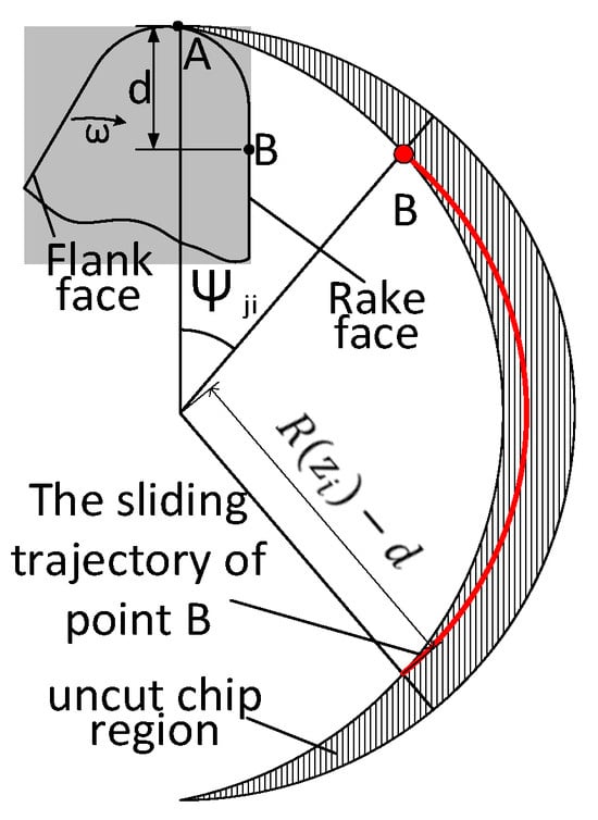According to the instantaneous uncut chip thickness model mentioned above, combined with the tool cutting workpiece section analysis, it is not difficult to find that in the cutting process, the sliding distance between the different points on the blade of the tool section and the workpiece is different. For example, when = 0, only the tip of the tool is in contact with the workpiece, and the rest of the points on the blade are in a no-load state. With the rotation of the tool, the uncut chip thickness slowly increases, and more points on the blade are slowly in contact with the workpiece, resulting in relative sliding. Figure 5 shows the contact between the ball-end milling cutter and the workpiece. It can be seen from the figure that during the cutting process, Point A slides relative to the workpiece throughout an iteration. The range of relative sliding between any point B on the front tool surface and the workpiece in one iteration is shown in the red line area in the figure.