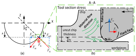 In this paper, the microscopic behavior of wear is analyzed by cutting tool section on the XOY plane. Take any section i as the research object, then the cutting forces which acting on section i are denoted as , and , as shown in Figure 7a. Where is the radius of the tool tip arc and is the tool tip angle. The force on the section is simplified as the force on points on the section, so that the force on any point k on the section in the three directions is, respectively, , , , then there is the following relation: