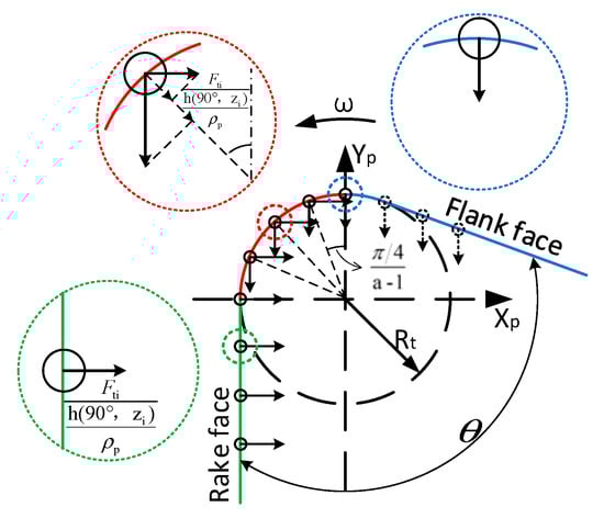 For the points on the flank face, that is, the blue area in Figure 8, it is only affected by the normal force , and when the wear is in the initial stage, only the points in the blue circle in Figure 8 participate in the iteration of the flank face, and the other points gradually join the iteration with the increase in the wear of the flank face.