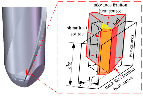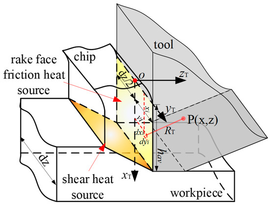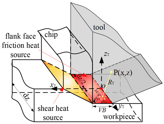 Since most of the heat generated by shearing is discharged with the chips, only part of the heat can be transferred to the tool, so the temperature of the tool is mainly affected by the heat source of the rake face and flank face, and the shear heat source is no longer analyzed separately. According to the thermodynamic model proposed by Wenlin Li [30], the temperature at any point on the tool can be given by the following formula:
