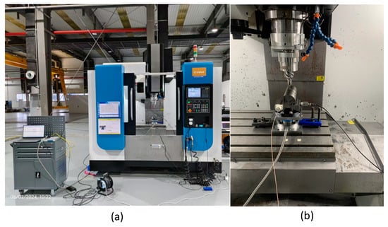 Experimental equipment: (a) CAMUMC850 (Jiangsu Branch of China Academy of Machinery Science and Technology Group Co., Ltd., Changzhou, China) three-axis milling machine; (b) processing site.