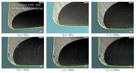 Figure 14 shows the wear of the milling cutter under different milling times, where the yellow line is the original shape of the blade, and the white dashed line is the wear of the tool section. As can be seen from the figure, the wear on the front tool face near the tip of the tool is the most severe. With the increase in milling time, the wear range gradually expands, and the most severe wear on the front tool face occurs at a certain distance from the cutting edge.
