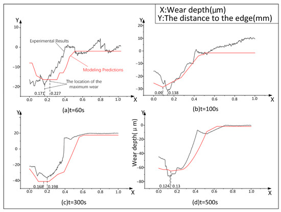 Comparison of experimental results and modeling predictions for rake face wear. (a) t = 60 s; (b) t = 100 s; (c) t = 300 s; (d) t = 500 s.