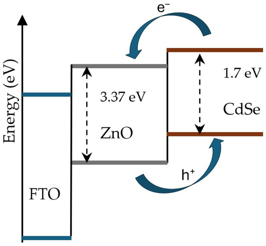 The combination of ZnO with CdSe has been shown to result in the formation of heterojunction photoanodes, which have been demonstrated to enhance charge separation, light absorption, photocatalytic activity, and stability. This, in turn, has been observed to lead to improved photoelectrochemical performance and increased electron-hole pair generation [1,17]. The interface between ZnO and CdSe is predicted to form a type II band alignment (Figure 1), thus facilitating the transfer of electrons from the conduction band of CdSe to ZnO, while holes migrate from the valence band of ZnO to CdSe. ZnO functions as an efficient electron transport layer due to its high electron mobility, while CdSe absorbs visible light and generates charge carriers [18,19].