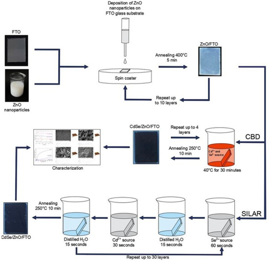 Cadmium selenide thin films were deposited on the FTO substrates with a ZnO layer via two distinct methods, SILAR and CBD, as illustrated in Figure 2.