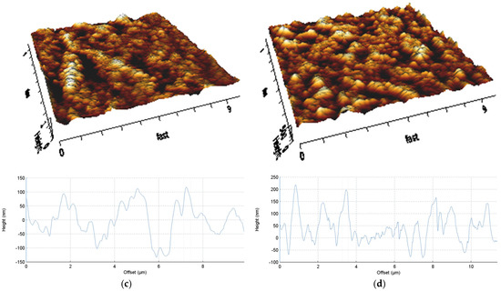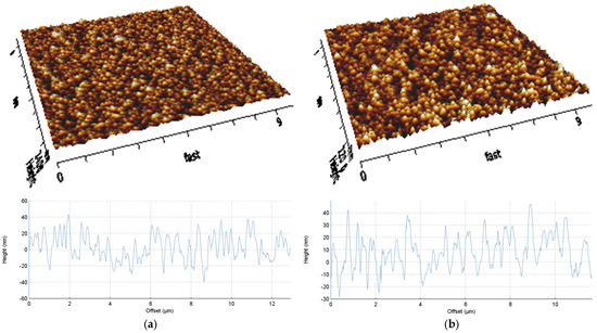 The cross-sectional profilogram illustrates the dimensions of each component on the surface structure, as well as the recurring patterns of elevations and depressions. A topographic view of the FTO surface (top of Figure 5a) shows that it is composed of evenly spaced small elevations and depressions, and the arrangement of the structural elements in the topographic image of the surface is the same as in the SEM image of this surface (Figure 4a). A topographic view of the surface of ZnO/FTO (top of Figure 5b) reveals that, similar to FTO, it consists of evenly spaced small bumps and depressions. The FTO cross-sectional profilogram (bottom of Figure 5a) demonstrates that this layer comprises structural elements with a width of up to 1 μm and a height of 100 nm. The scanned FTO surface exhibited a root mean square roughness of 15.85 nm, while the scanned ZnO/FTO surface (Table 2) displayed a root mean square roughness of 14.49 nm. These results indicate that the ZnO/FTO surface was less rough than the original FTO surface. The same trend is observed in the work of [36], where the surface roughness was reduced after the coating of the polymer surface with a ZnO layer.