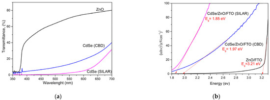 UV–vis transmittance spectra of ZnO and CdSe thin films obtained on ZnO/FTO surfaces by different methods (a); a plot of (αhν)2 versus photon energy (b).