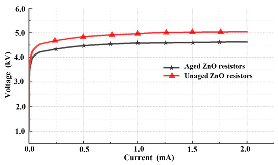 The volt–ampere characteristic curve of ZnO resistors with different aging degrees.