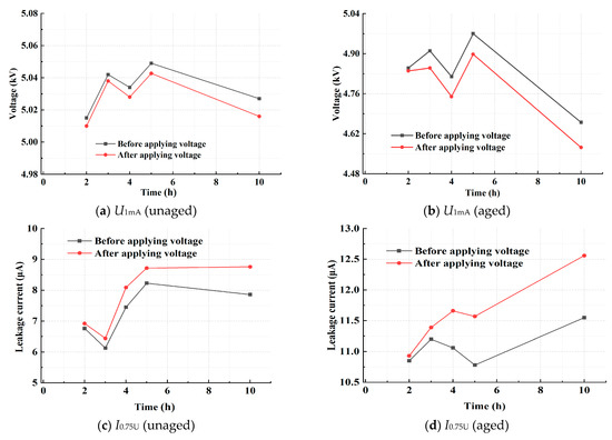The volt–ampere characteristic was measured during each withstand voltage to record the electrical parameters. The U1mA of the resistor experienced a decrease, while the I0.75U exhibited an increase, under different withstand voltage times with a working frequency of 50 Hz (Figure 5).