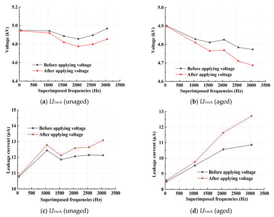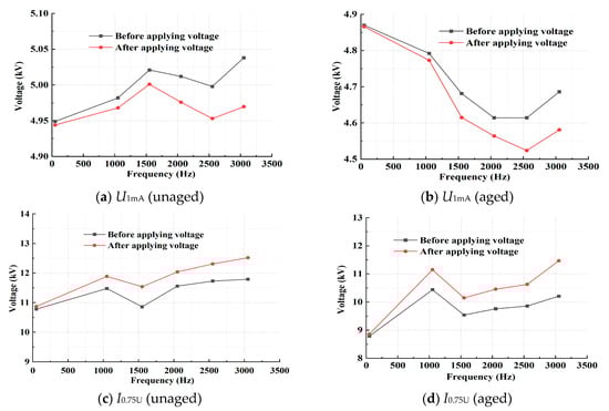 The resistor U1mA experienced a decrease, while the I0.75U increased, after applying high superimposed harmonics for a long time (Figure 8). In the aging test with the 61st harmonic superimposed on the working frequency, the U1mA of the unaged resistor was 4.952 kV before the test and 4.891 kV after the test, and the I0.75U was 12.15 μA before the test and 13.14 μA after the test. Under the same test conditions, the U1mA of the aged resistor was 4.774 kV and 4.692 kV before and after the test, respectively. The I0.75U was 10.91 μA and 11.91 μA, respectively.