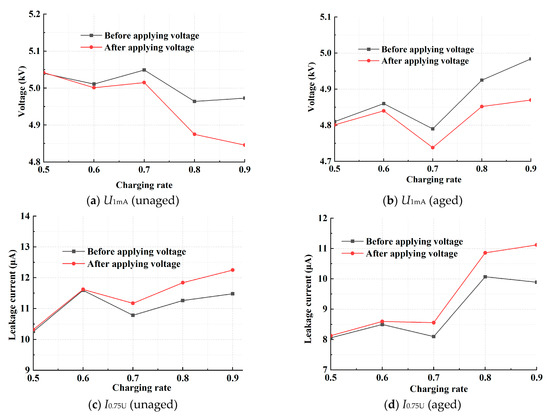 The results showed that at a charge rate of 0.8, the voltage amplitude was approximately 4.0 kV, and the U1mA values of the unaged resistor before and after the withstand voltage were 4.96 kV and 4.875 kV, with I0.75U values of 11.26 μA and 11.84 μA, respectively. The corresponding U1mA for the aged resistor was 4.92 kV and 4.852 kV, with I0.75U values of 10.07 μA and 10.86 μA, respectively. With a charge rate of 0.9, the voltage amplitude was approximately 4.5 kV, the U1mA values of the unaged resistor before and after withstand voltage were 4.973 kV and 4.846 kV, respectively, and the I0.75U values were 11.48 μA and 12.25 μA, respectively. For the aged resistor, the U1mA values were 4.984 kV and 4.871 kV, and the I0.75U values were 11.26 μA and 11.84 μA, respectively. Under smaller withstand voltage conditions, such as 0.5 and 0.6, there was no significant change in the parameters of the resistor; however, when the higher charge rate was applied for a longer period, the U1mA of the resistor experienced a decrease, while I0.75U underwent a significant increase, which caused the resistor’s active power to increase and led to a significant increase in the temperature of the resistor at the end of the aging test.