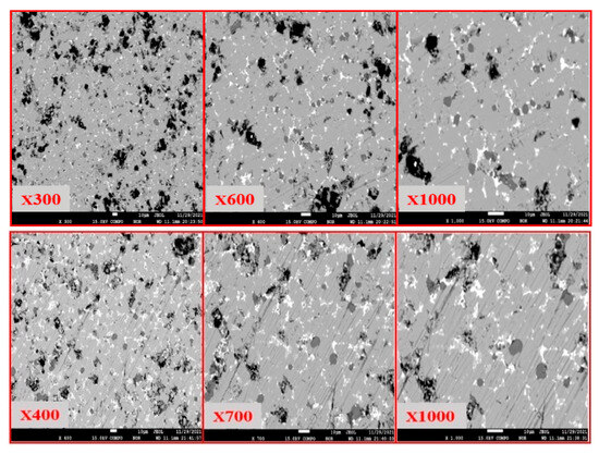 During the sintering process at high temperatures, the ZnO resistor will form a symmetrical double-Schottky barrier layer. The linear performance is determined by the barrier height, and the microstructure is arranged in the form of boundary–grains. Under long-term high-frequency overvoltage, the resistive leakage current of resistors increases, and the electric charge on their microstructures migrates due to thermal motion, resulting in asymmetrical barrier layers on both sides of the grain boundaries that reduce in height. Aging tests on the resistors suggest that their leakage current and DC reference voltage change most significantly when subjected to different working conditions due to increased chargeability. Furthermore, a single harmonic frequency has a stronger impact on the aging of resistors than superimposed harmonics. Additionally, the prolonged application of an increasing voltage at a power frequency exhibits little impact on the electrical parameters of either aged or non-aged resistors. The surface of the non-aged resistor is smooth and flat, and the side insulating paint is glossy, without obvious abnormality. The aluminum electrode layer of an aging resistor will have traces of suspected chemical corrosion, the insulating paint on the side will be matte and rough, and the color will be uneven. Before scanning, we kept the surface of the resistor clean, complete, and free of dirt and oil stains. The results of the electronic scanning showed that the surface morphology of the ZnO resistor in different states was not significantly different under 1000× magnification, as shown in Figure 9.