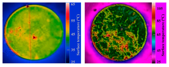 This can lead to the deterioration of the resistor, as seen in the laboratory test conducted at 25 °C with 12 shocks per 1 min. The temperature of the unaged resistor was close to 37.7 °C, while the temperature of the unaged resistor was close to 42 °C after 72 h of high-frequency testing, as shown in Figure 12. Under the impulse current, there is a concentration of thermal stress on the surface of the arrester, which will lead to grain breakage.