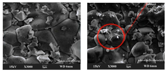 The micromorphology of the arrester was observed, and it was found that the arrester grains were damaged after multiple shocks, which would occur under the impact current, as shown in Figure 13.