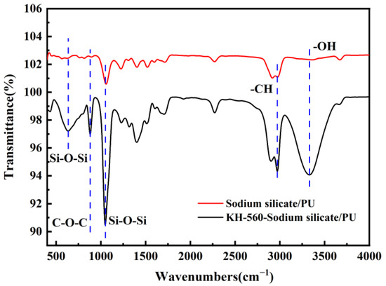 Figure 2 shows the FTIR analysis results of the coatings before and after modification. The changes in the characteristic peaks of the infrared spectra of sodium silicate/PU and KH560-treated silicate/PU were analyzed to investigate the molecular-level modifications of silicate with silane coupling agent KH560. The results are shown in Figure 2. Among them, the absorption peak near 3412 cm−1 corresponds to the -OH stretching vibration, the peak near 900 cm−1 is attributed to the epoxy group vibration, and the peak near 1100 cm−1 is caused by the Si-O-Si vibration. As shown in the figure, after modification with the silane coupling agent, the absorption peak near 1100 cm−1, resulting from the stretching vibration of Si-O-Si, is enhanced, indicating that the silane coupling agent has formed chemical bonds with the inorganic silicate. The peak near 3412 cm−1, caused by the stretching vibration of hydroxyl groups (-OH), is significantly stronger than that of the unmodified silicate and polyurethane material. This may be due to the hydrolysis of the silane coupling agent, which forms silanols. Some of these silanols did not react with polar groups to form bonds, leading to an increase in the number of -OH groups on the surface. During the modification process, the silane coupling agent undergoes hydrolysis and condensation reactions with the Si-OH bonds on the surface of the silicate, introducing epoxy groups to the silicate surface. Therefore, the peak observed near 880 cm−1 in the infrared spectrum can be attributed to the characteristic absorption peak of the epoxy group.