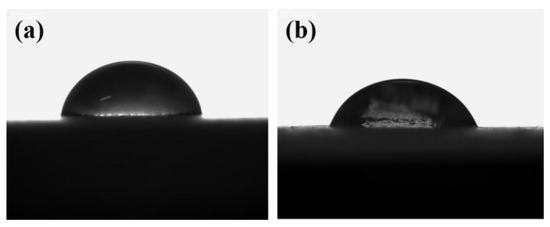 Morphology of contact angle testing. (a) Contact angle of silicate solution on surface of PU coating before modification. (b) Contact angle of silicate solution on surface of PU coating after modification.