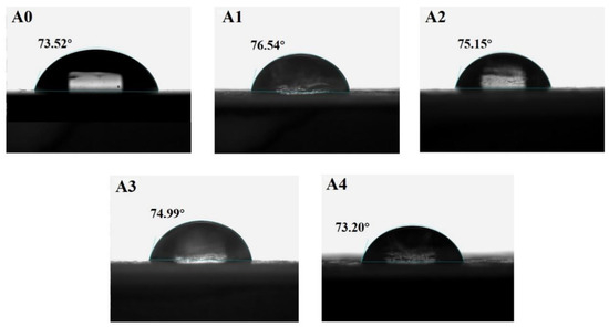 Water contact angle of modified sodium silicate/PU coatings. A0 (73.52°), A1 (76.54°), A2 (75.15°), A3 (74.99°), A4 (73.20°).