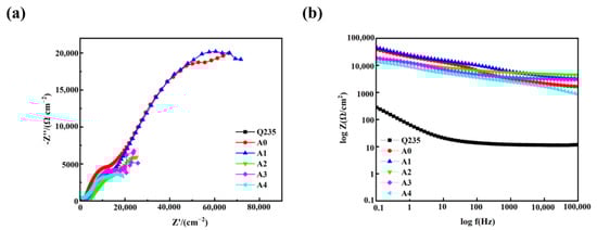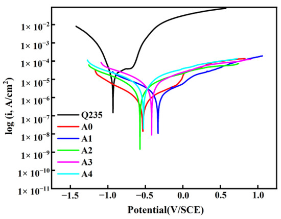 Figure 8 illustrates the potentiodynamic polarization curves of coatings with different sodium silicate contents and bare low-carbon steel after immersion in a 3.5 wt% sodium chloride solution for 24 h. It is generally believed that the corrosion potential is related to the thermodynamic tendency of corrosion, while the corrosion current density, as a kinetic parameter, reflects the actual corrosion rate [20]. Studies have shown that surfaces with higher corrosion potentials and lower corrosion current densities exhibit better corrosion resistance [21]. As seen from the potentiodynamic polarization curves, compared to bare Q235, the samples coated with the coatings exhibit lower corrosion current densities and higher corrosion potentials, indicating that the coatings provide a certain level of protection for the low-carbon steel substrate. Table 5 shows the corrosion potential and corrosion current density of the coatings obtained by fitting the potentiodynamic polarization curves. From Table 5, it can be observed that, compared to bare low-carbon steel, the corrosion current density of the A1 samples decreased from 1.29 × 10−5 A/cm2 to 6.29 × 10−7 A/cm2, a reduction of two orders of magnitude. The corrosion potential shifted positively from −0.93 V to −0.53 V, indicating an improvement in corrosion resistance. The corrosion current densities of the pure resin coatings and the sodium silicate-added coatings are within the same order of magnitude. However, compared to the pure resin coatings, the sodium silicate-added coatings exhibit higher corrosion potentials, suggesting better durability. This is primarily due to the physical and chemical reactions between sodium silicate and the organic resin, which embed silicon-containing groups into the resin chains, forming a dense and stable three-dimensional network structure. This structure acts as a physical barrier, preventing the penetration of corrosive media and achieving corrosion protection. As the proportion of sodium silicate increases, the corrosion potential of the coatings gradually decreases. Among them, the coating with 60 wt% sodium silicate content exhibits the lowest corrosion current and the highest corrosion potential, demonstrating the best corrosion resistance.