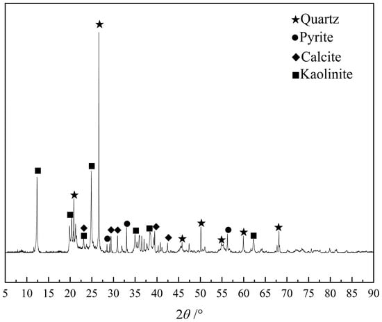 The raw material consists of the tailings derived from Ningwu coal gangue following jig separation. As detailed in Table 1, the chemical composition primarily includes SiO2, Al2O3, Fe2O3, CaO, and SO3, among others. Specifically, the content of SO3 and Fe2O3 in the raw materials is 1.78% and 3.89%, respectively, indicating that this material falls into the category of low-sulfur coal gangue. As illustrated by the XRD pattern of the raw materials presented in Figure 1, the primary mineral constituents are kaolinite and quartz, along with minor amounts of calcite and pyrite.