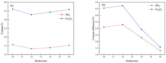 Influence of stroke on separation results. (a) Content of SO3 and Fe2O3 in tailings. (b) Difference content of SO3 and Fe2O3 between concentrate and tailings.