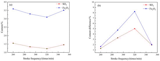Influence of stroke frequency on separation results. (a) Content of SO3 and Fe2O3 in tailings. (b) Difference content of SO3 and Fe2O3 between concentrate and tailings.