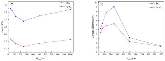 Effect of dmax on the separation results of Fuller distribution. (a) Content of SO3 and Fe2O3 in tailings. (b) Difference content of SO3 and Fe2O3 between concentrate and tailings.