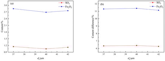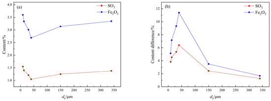 Effect of de on RRSB distribution separation results. (a) Content of SO3 and Fe2O3 in tailings. (b) Difference content of SO3 and Fe2O3 between concentrate and tailings.